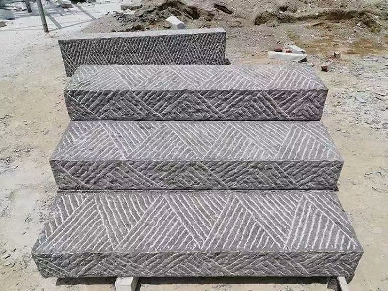 青石臺階石,青石石材切割后按客戶要求表面處理有手打鏨道面、荔枝面、火燒面還有部分要求自然面就是把平整的機切面做出凸凹不平的表面。